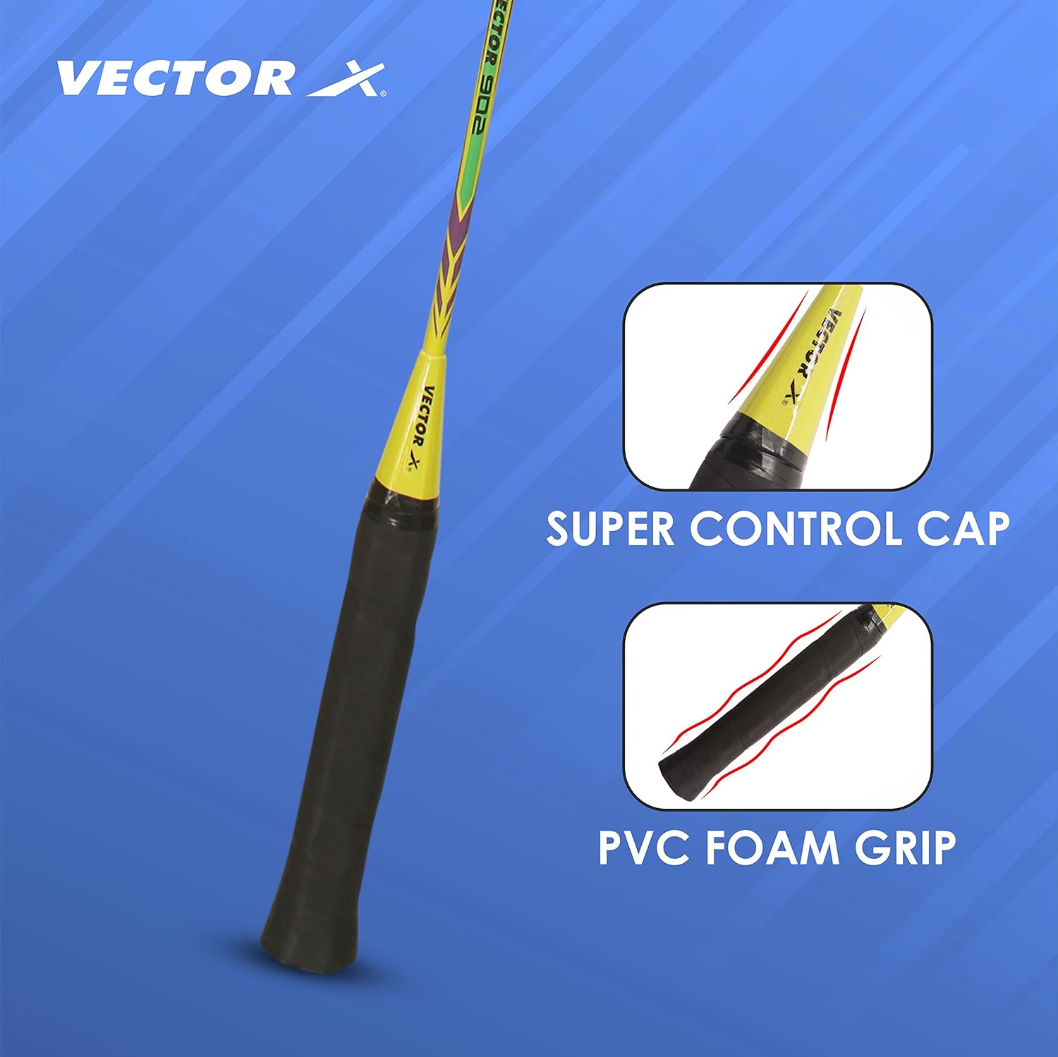 The Vector X VXB-902 badminton racket features an aluminum composite frame with a one-piece jointless design for better durability, control, and beginner-friendly performance.